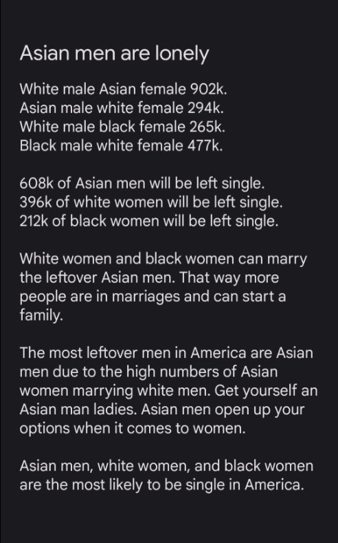 If any Asian men struggle or do ok in dating, we all need to work on ourselves and love ourselves and be confident in who we are as a competitor in the dating market. The dating marriage statistics doesn't look too good for asian men, however we all should be hopeful things we turn around for us as Asian men become more popular with women of all ethnicities/races.